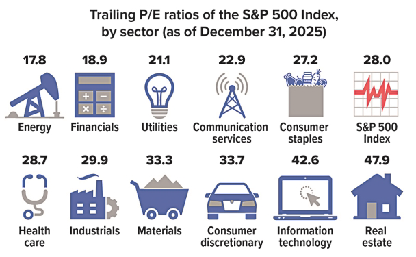 At the end of 2025, investors were paying $28 for each dollar of corporate earnings from companies in the S&P 500 Index, according to the trailing P/E ratio. This is higher than the five-year average trailing P/E of 25.0 and the 10-year average of 23.0. The forward P/E ratio was 22.0, above the five-year average of 20.0 and the 10-year average of 18.7.1–2