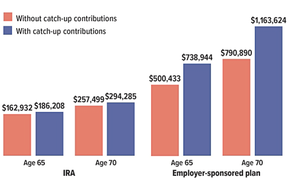 Additional amounts that might be accrued between age 50 and age 65 or 70, based on making maximum annual contributions at current limits to an IRA or an employer-sponsored plan (includes additional catch-up for ages 60 to 63)