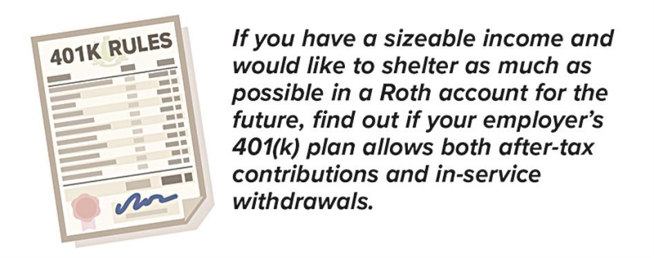 If you have a sizeable income and would like to shelter as much as possible in a Roth account for the future, find out if your employer’s 401(k) plan allows both after-tax contributions and in-service withdrawals. If so, you could also make special after-tax contributions to your traditional 401(k) and then move (or convert) the funds to a Roth IRA or a Roth 401(k). This strategy — called the mega backdoor Roth — is only an option for some people under limited circumstances.